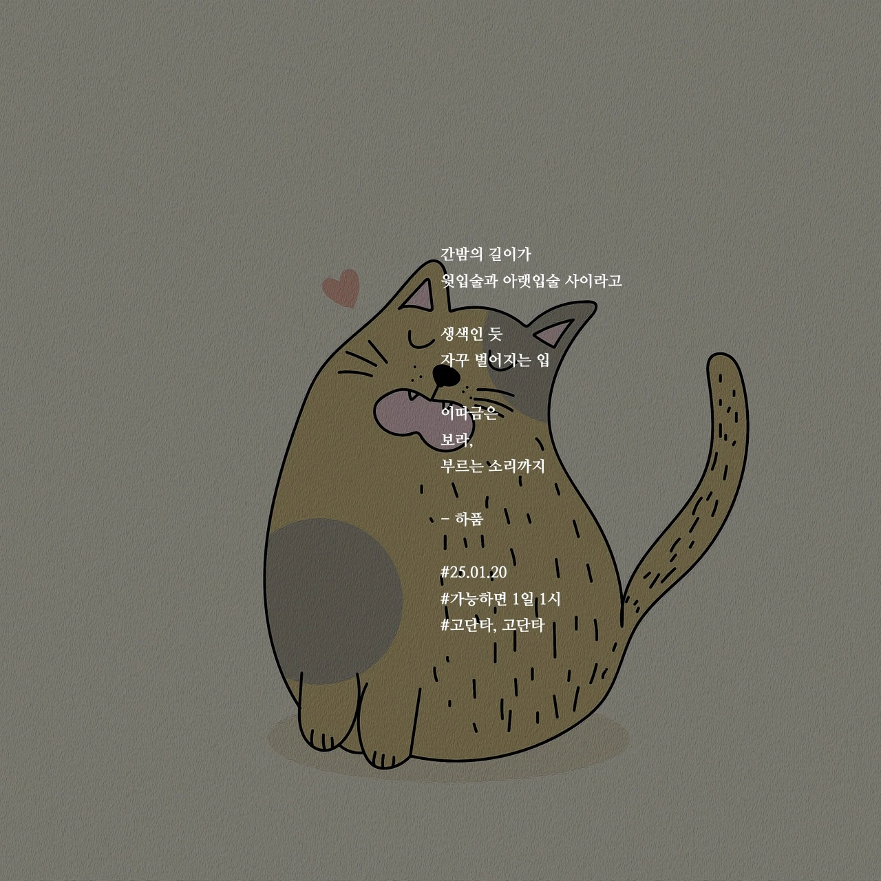 간밤의 길이가윗입술과 아랫입술 사이라고생색인 듯자꾸 벌어지는 입이따금은보라,부르는 소리까지- 하품#25.01.20#가능하면 1일 1시#고단타, 고단타