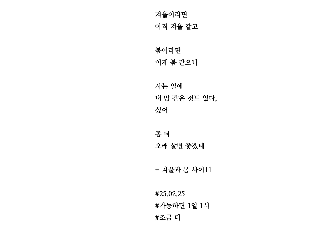 겨울이라면아직 겨울 같고봄이라면이제 봄 같으니사는 일에내 맘 같은 것도 있다,싶어좀 더오래 살면 좋겠네- 겨울과 봄 사이11#25.02.25#가능하면 1일 1시#조금 더