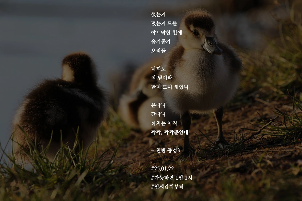 섰는지떴는지 모를야트막한 천에옹기종기오리들너희도설 밑이라한데 모여 씻었니온다니간다니까치는 아직깍깍, 깍깍뿐인데- 천변 풍경3#25.01.22#가능하면 1일 1시#일찌감치부터