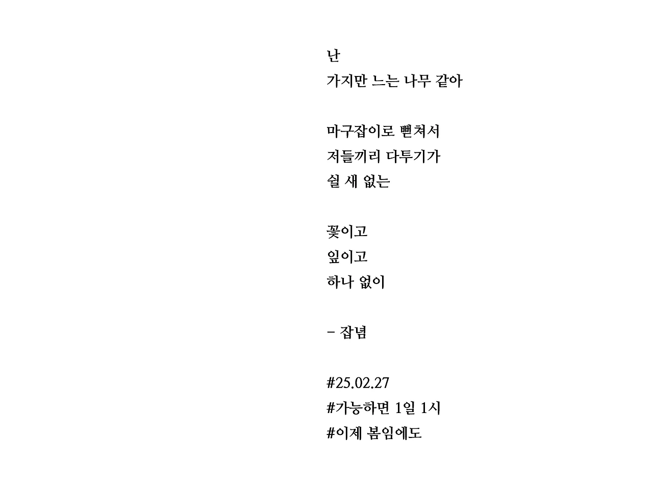 난가지만 느는 나무 같아마구잡이로 뻗쳐서저들끼리 다투기가쉴 새 없는꽃이고잎이고하나 없이- 잡념#25.02.27#가능하면 1일 1시#이제 봄임에도