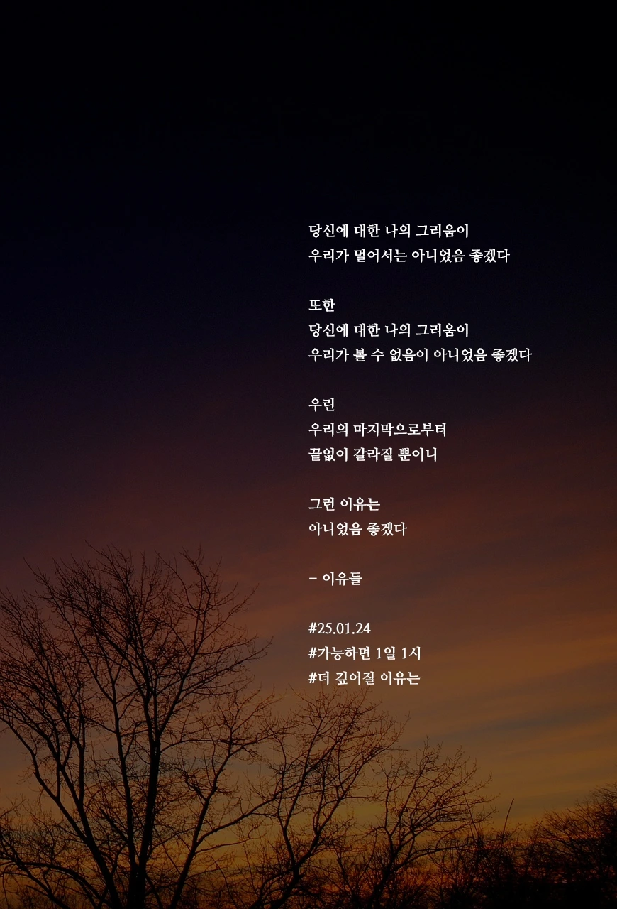 당신에 대한 나의 그리움이우리가 멀어서는 아니었음 좋겠다또한당신에 대한 나의 그리움이우리가 볼 수 없음이 아니었음 좋겠다우린우리의 마지막으로부터끝없이 갈라질 뿐이니그런 이유는아니었음 좋겠다- 이유들#25.01.24#가능하면 1일 1시#더 깊어질 이유는