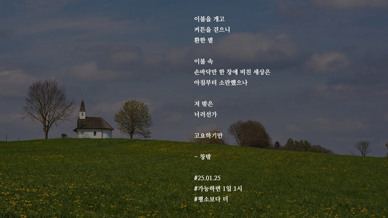 이불을 개고커튼을 걷으니환한 볕이불 속손바닥만 한 창에 비친 세상은아침부터 소란했으나저 밖은너러선가고요하기만- 창밖#25.01.25#가능하면 1일 1시#평소보다 더 작가의 말: 잔잔한 비와 지나가는 계절