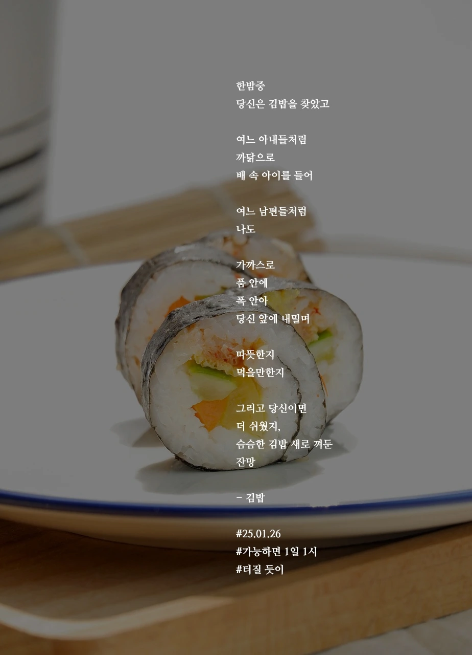 한밤중당신은 김밥을 찾았고여느 아내들처럼까닭으로배 속 아이를 들어여느 남편들처럼나도가까스로품 안에폭 안아당신 앞에 내밀며따뜻한지먹을만한지그리고 당신이면더 쉬웠지,슴슴한 김밥 새로 껴둔잔망- 김밥#25.01.26#가능하면 1일 1시#터질 듯이
