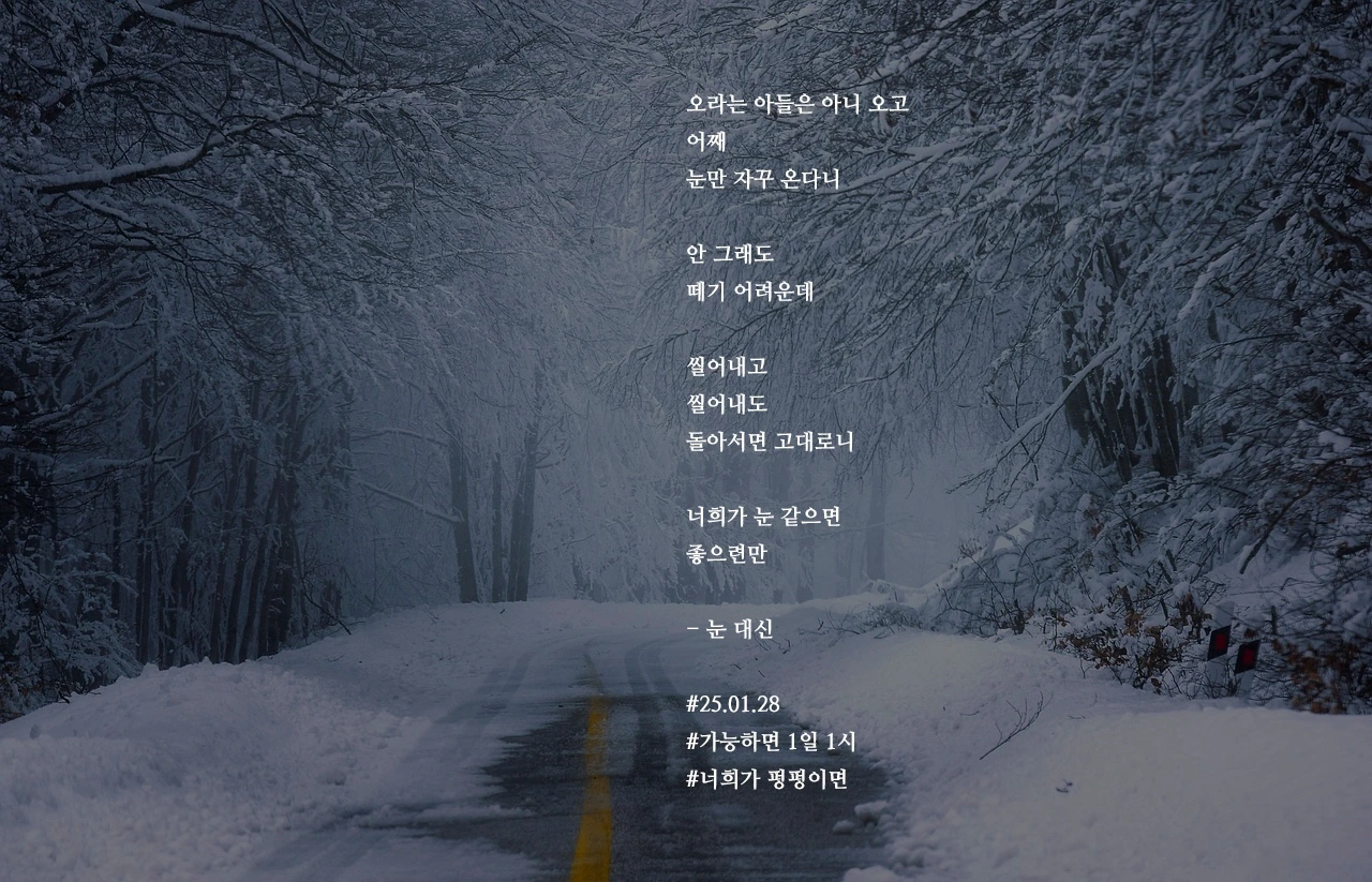 오라는 아들은 아니 오고어째눈만 자꾸 온다니안 그래도떼기 어려운데씰어내고씰어내도돌아서면 고대로니너희가 눈 같으면좋으련만- 눈 대신#25.01.28#가능하면 1일 1시 #너희가 펑펑이면작가의 말: 보고 싶어라, 아이들아