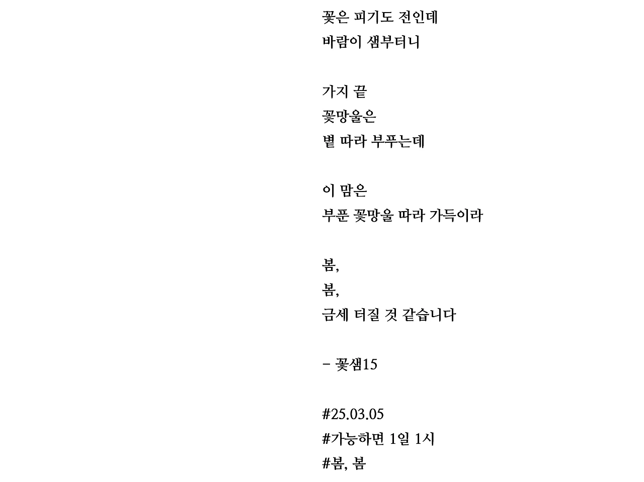 꽃은 피기도 전인데바람이 샘부터니가지 끝꽃망울은볕 따라 부푸는데이 맘은부푼 꽃망울 따라 가득이라봄,봄,금세 터질 것 같습니다- 꽃샘15#25.03.05#가능하면 1일 1시#봄, 봄