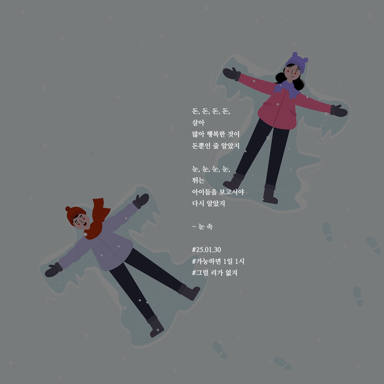 돈, 돈, 돈, 돈,살아많아 행복한 것이돈뿐인 줄 알았지눈, 눈, 눈, 눈,뛰는아이들을 보고서야다시 알았지- 눈 속#25.01.30#가능하면 1일 1시#그럴 리가 없지 작가의 말: 이제 오는 봄엔 꽃을 보며