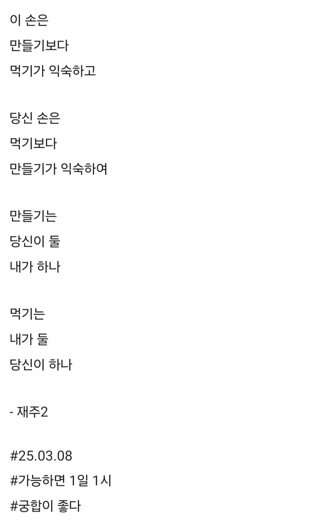 이 손은만들기보다먹기가 익숙하고당신 손은먹기보다만들기가 익숙하여만들기는당신이 둘내가 하나먹기는내가 둘당신이 하나- 재주2#25.03.08#가능하면 1일 1시#궁합이 좋다