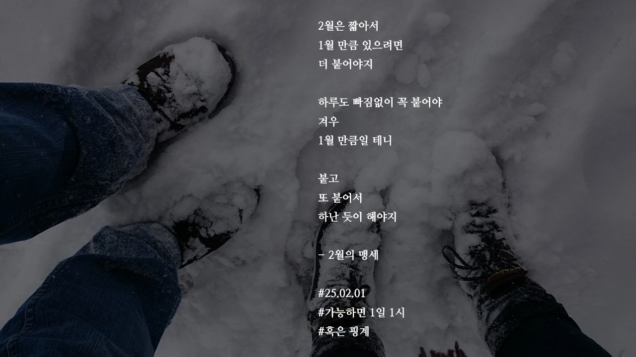 2월은 짧아서1월 만큼 있으려면더 붙어야지하루도 빠짐없이 꼭 붙어야겨우1월 만큼일 테니붙고또 붙어서하난 듯이 해야지- 2월의 맹세#25.02.01#가능하면 1일 1시#혹은 핑계 작가의 말: 그렇게 꼭 붙었었네