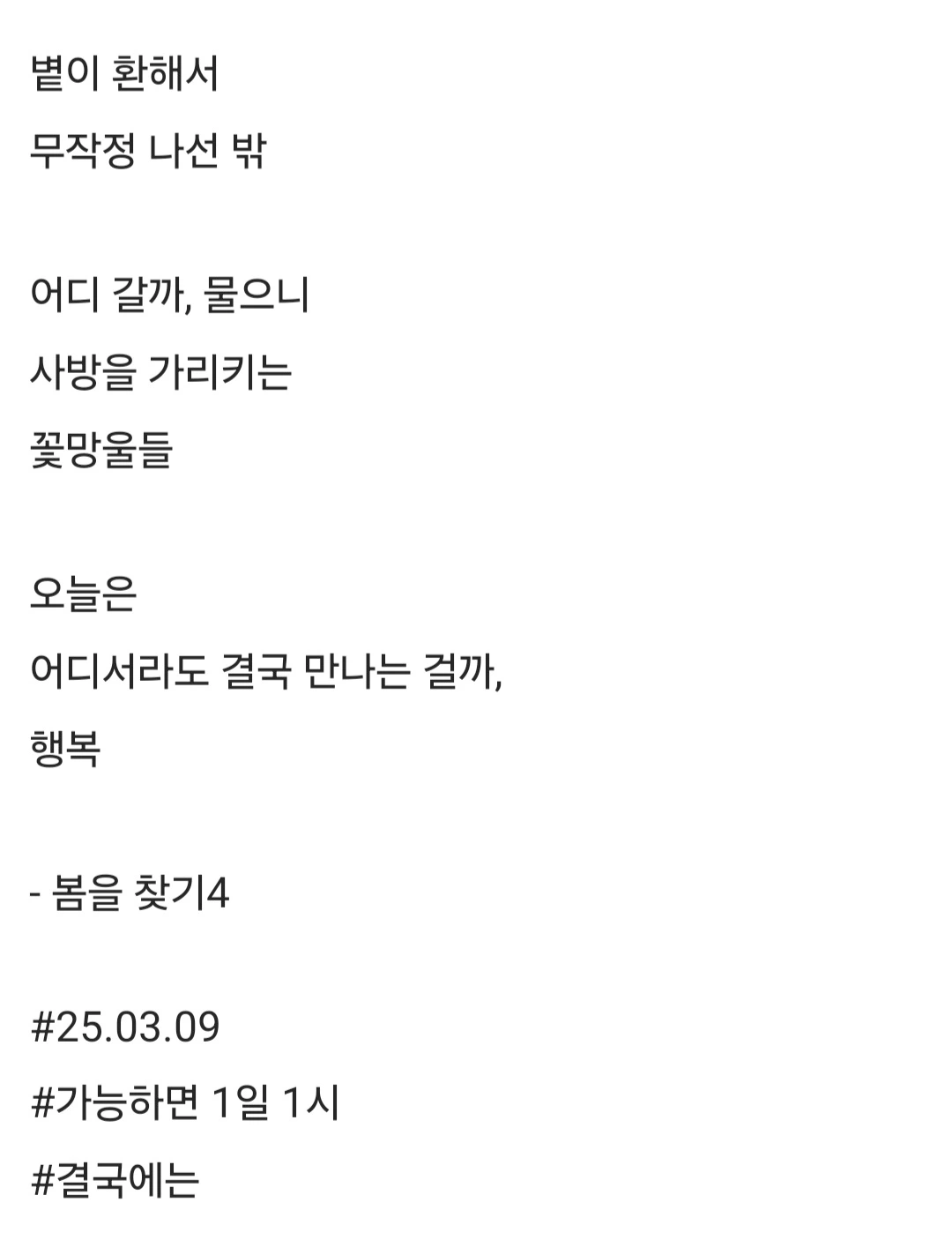 볕이 환해서무작정 나선 밖어디 갈까, 물으니사방을 가리키는꽃망울들오늘은어디서라도 결국 만나는 걸까,행복- 봄을 찾기4#25.03.09#가능하면 1일 1시#결국에는