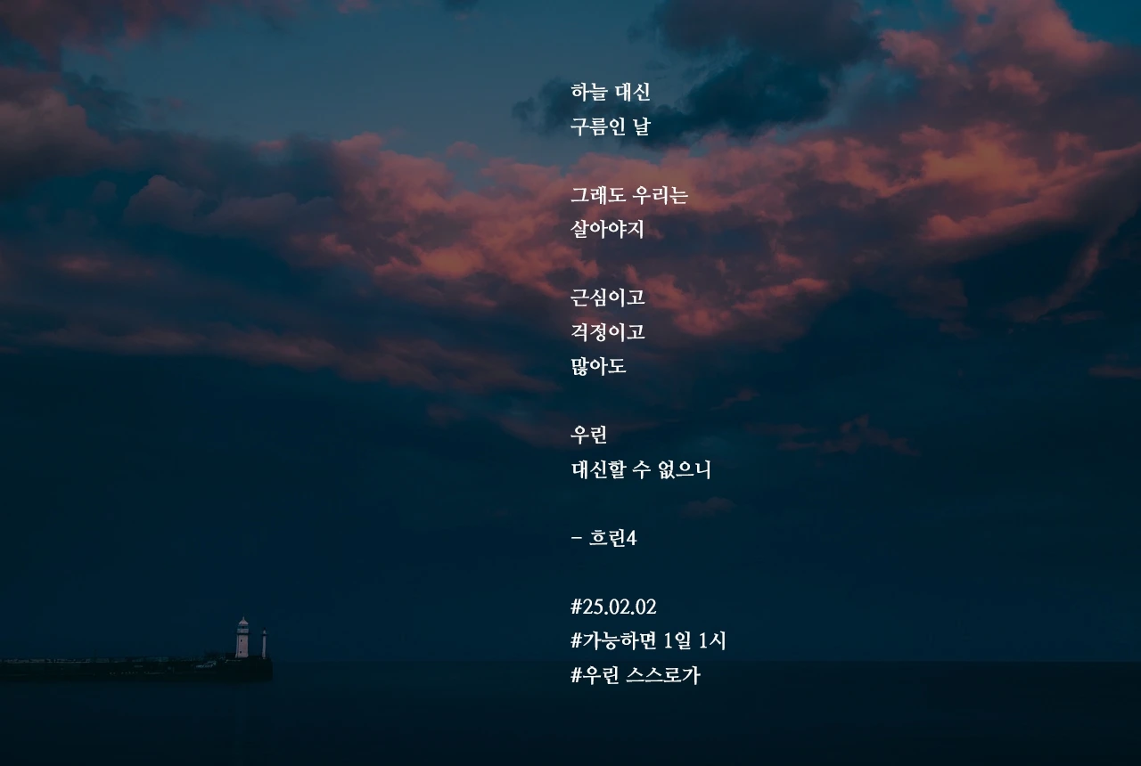 하늘 대신구름인 날그래도 우리는살아야지근심이고걱정이고많아도우린대신할 수 없으니- 흐린4#25.02.02#가능하면 1일 1시#우린 스스로가