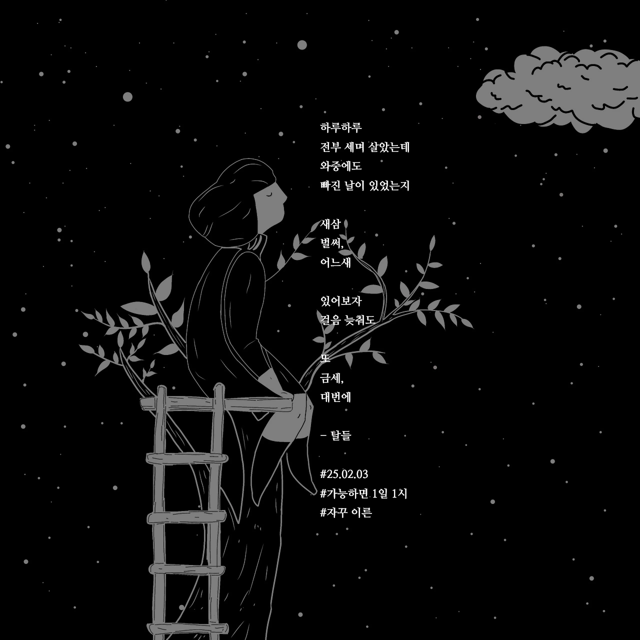 하루하루전부 세며 살았는데와중에도빠진 날이 있었는지새삼벌써,어느새있어보자걸음 늦춰도또금세,대번에- 날들#25.02.03#가능하면 1일 1시#자꾸 이른