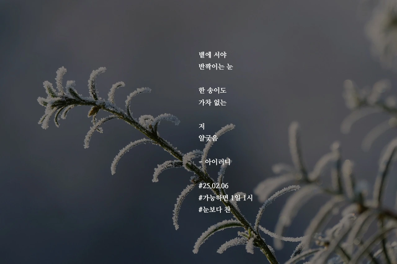 볕에 서야반짝이는 눈한 송이도가차 없는저얄궂음- 아이러니#25.02.06#가능하면 1일 1시#눈보다 찬
