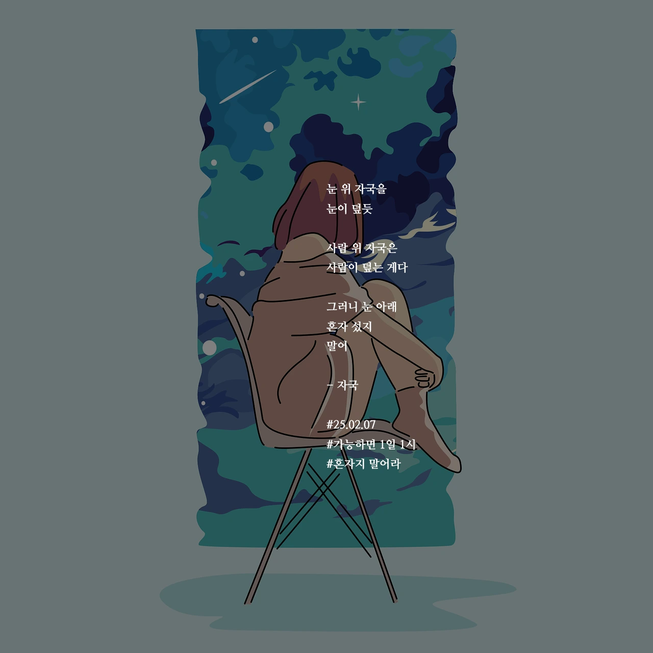 눈 위 자국을눈이 덮듯사람 위 자국은사람이 덮는 게다그러니 눈 아래혼자 섰지말어- 자국#25.02.07#가능하면 1일 1시#혼자지 말어라