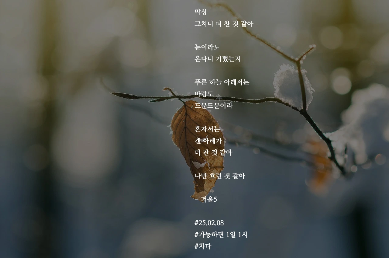 막상그치니 더 찬 것 같아눈이라도온다니 기뻤는지푸른 하늘 아래서는바람도드문드문이라혼자서는갠 아래가더 찬 것 같아나만 흐린 것 같아- 겨울5#25.02.08#가능하면 1일 1시 #차다 작가의 말: 그런 계절을 지났으니 보다 따뜻하게