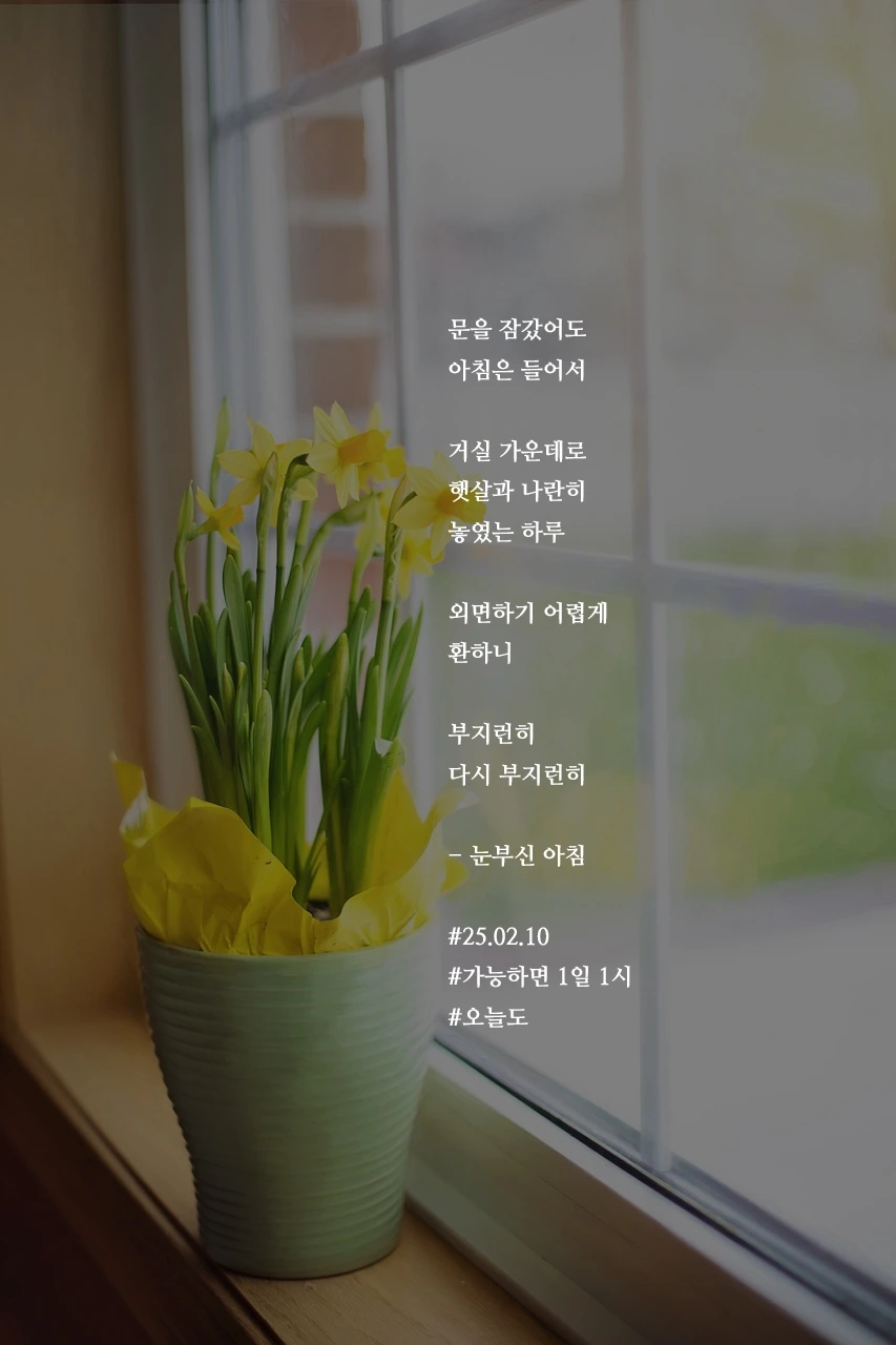 문을 잠갔어도아침은 들어서거실 가운데로햇살과 나란히놓였는 하루외면하기 어렵게환하니부지런히다시 부지런히- 눈부신 아침#25.02.10#가능하면 1일 1시#오늘도