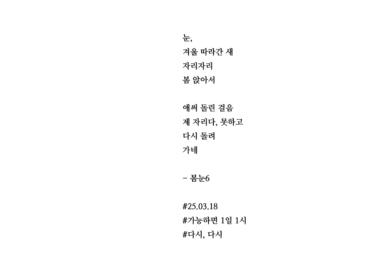 눈,겨울 따라간 새자리자리봄 앉아서애써 돌린 걸음제 자리다, 못하고다시 돌려가네- 봄눈6#25.03.18#가능하면 1일 1시#다시, 다시