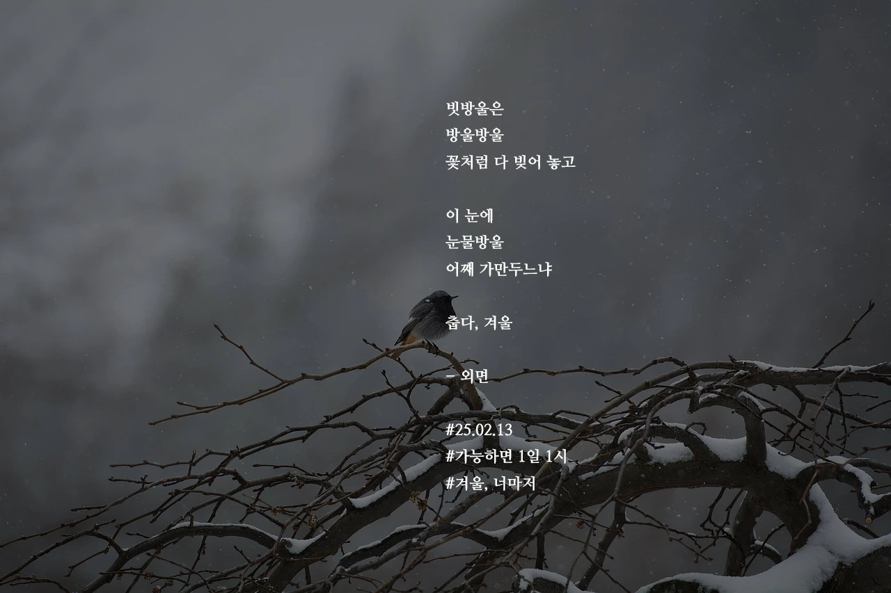 빗방울은방울방울꽃처럼 다 빚어 놓고이 눈에눈물방울어째 가만두느냐춥다, 겨울- 외면#25.02.13#가능하면 1일 1시#겨울, 너마저