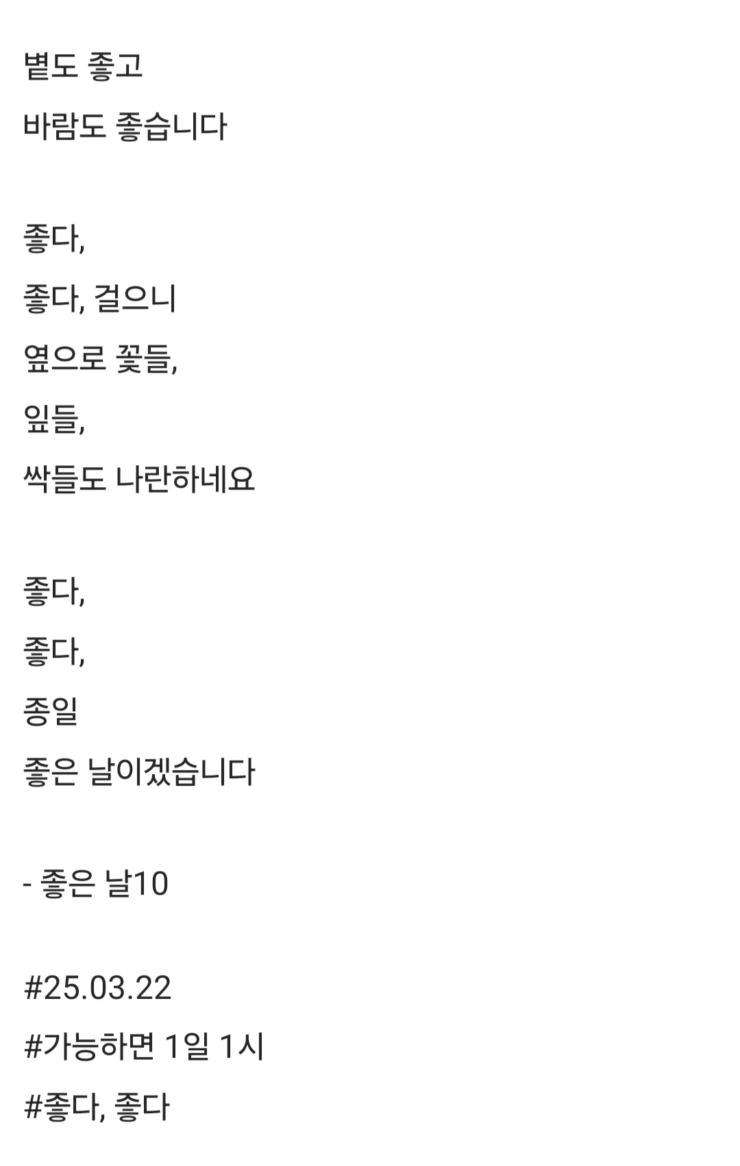볕도 좋고바람도 좋습니다좋다,좋다, 걸으니옆으로 꽃들,잎들,싹들도 나란하네요좋다,좋다,종일좋은 날이겠습니다- 좋은 날10#25.03.22#가능하면 1일 1시#좋다, 좋다