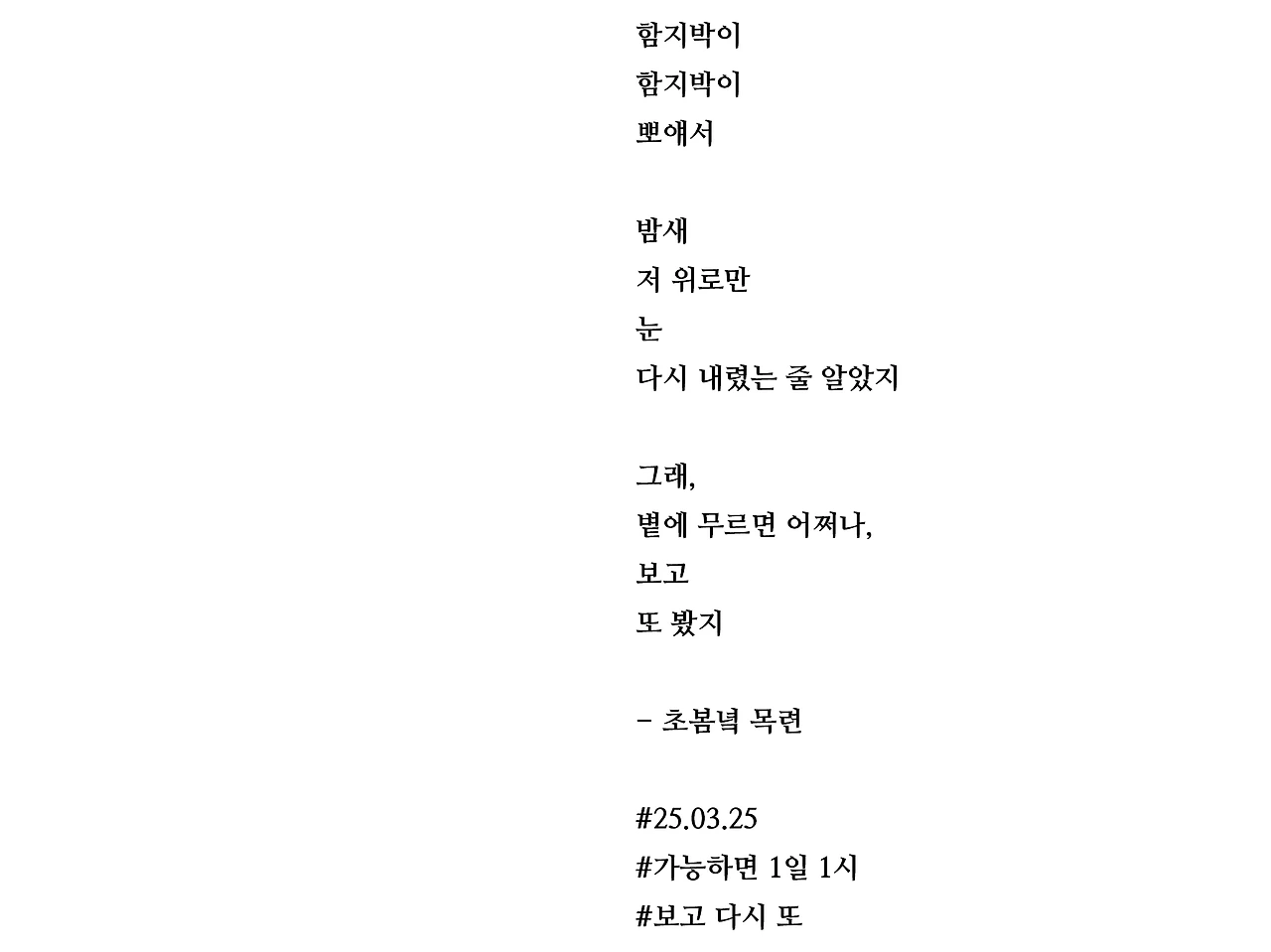 함지박이함지박이뽀얘서밤새저 위로만눈다시 내렸는 줄 알았지그래,볕에 무르면 어쩌나,보고또 봤지- 초봄녘 목련#25.03.25#가능하면 1일 1시#보고 다시 또