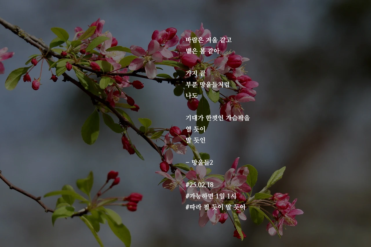 바람은 겨울 같고볕은 봄 같아가지 끝부푼 망울들처럼나도기대가 한껏인 가슴팍을열 듯이말 듯인- 망울들2#25.02.18#가능하면 1일 1시#따라 필 듯이 말 듯이