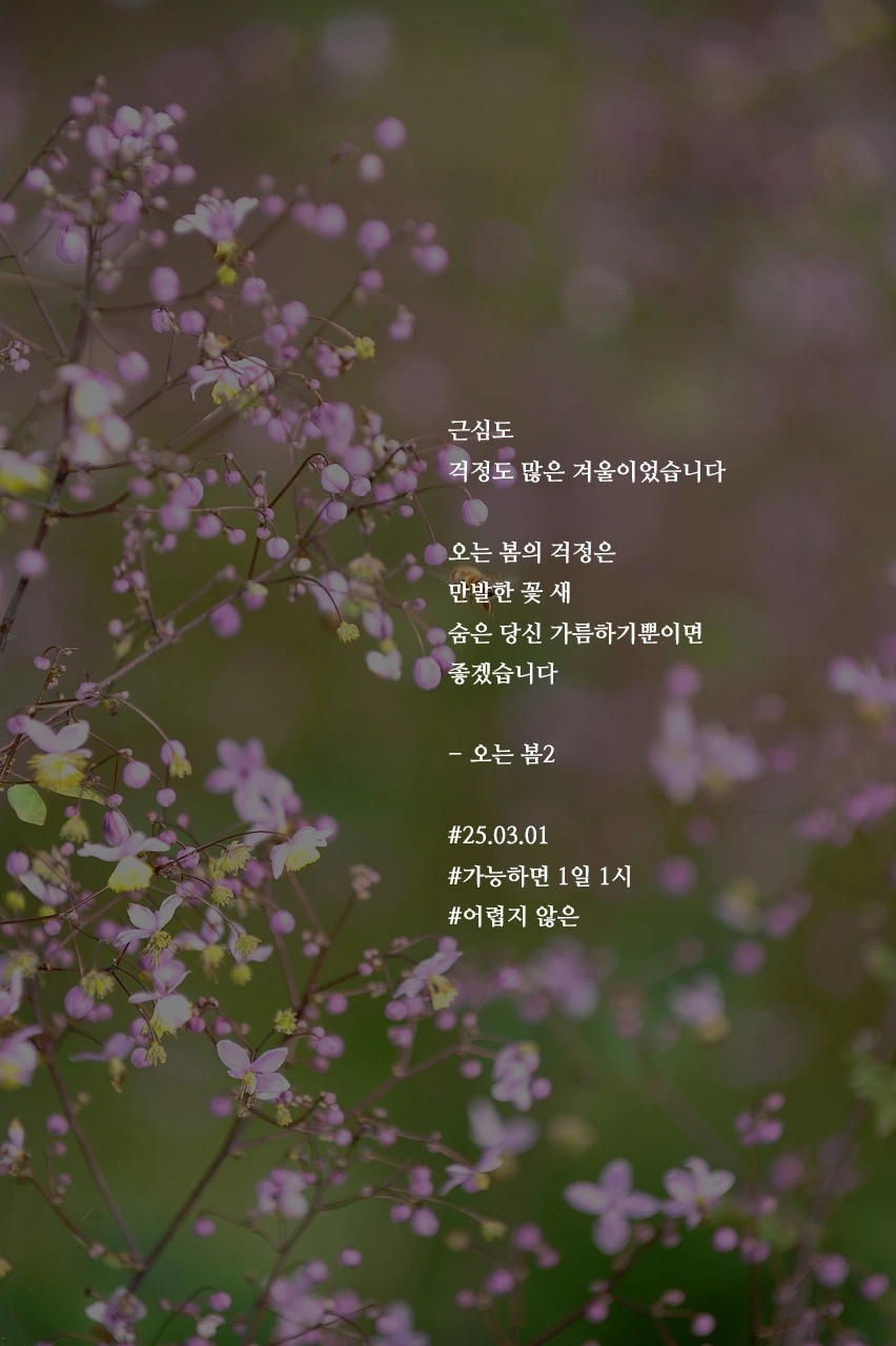 근심도걱정도 많은 겨울이었습니다오는 봄의 걱정은만발한 꽃 새숨은 당신 가름하기뿐이면좋겠습니다- 오는 봄2#25.03.01#가능하면 1일 1시#어렵지 않은 작가의 말: 그것만이면