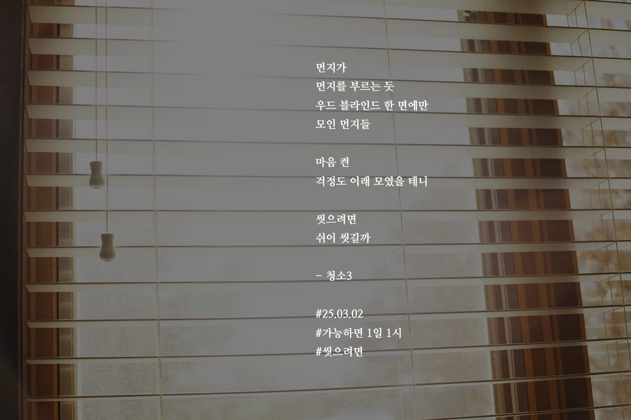 먼지가먼지를 부르는 듯우드 블라인드 한 면에만모인 먼지들마음 켠걱정도 이래 모였을 테니씻으려면쉬이 씻길까- 청소3#25.03.02#가능하면 1일 1시#씻으려면 작가의 말: 한데 모였으니 씻기도