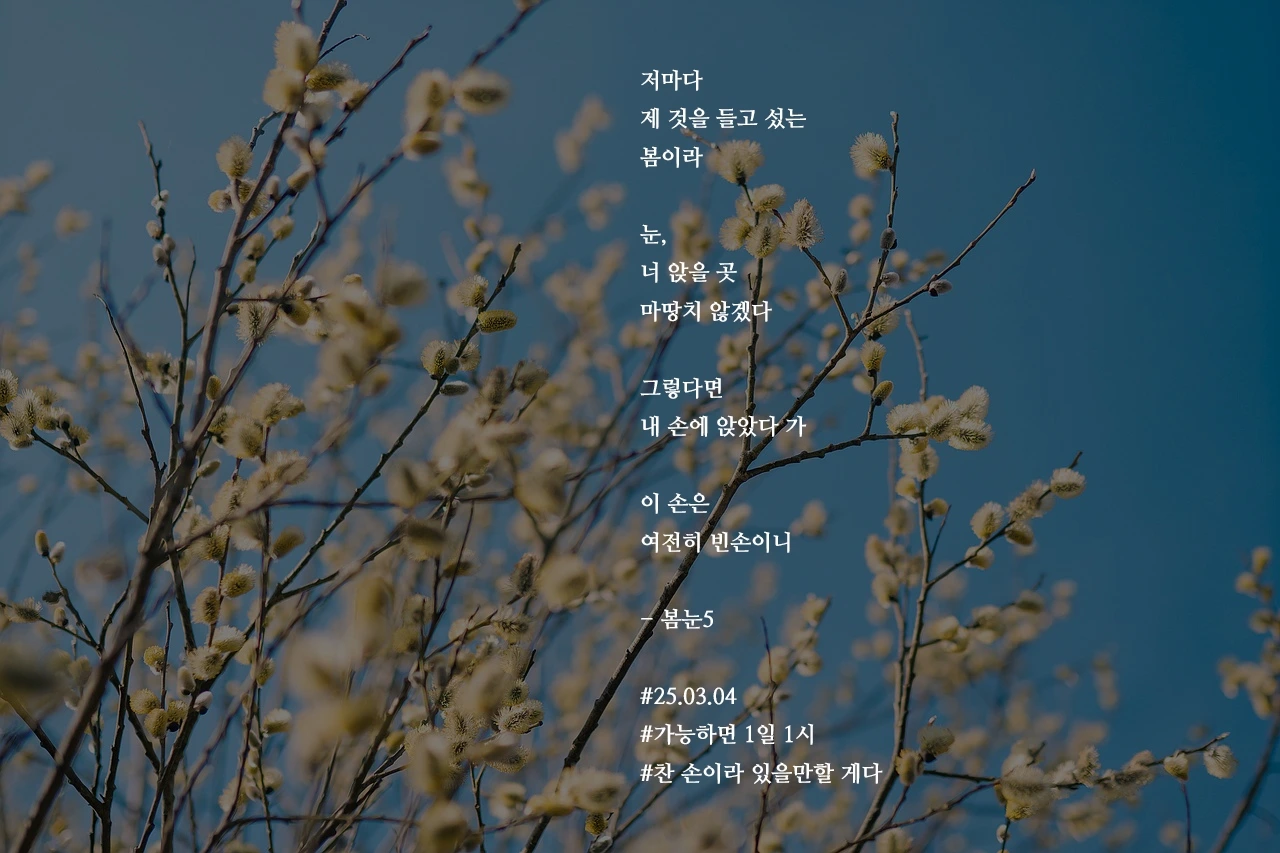 저마다제 것을 들고 섰는봄이라눈,너 앉을 곳마땅치 않겠다그렇다면내 손에 앉았다 가이 손은여전히 빈손이니- 봄눈5#25.03.04#가능하면 1일 1시#찬 손이라 있을만할 게다