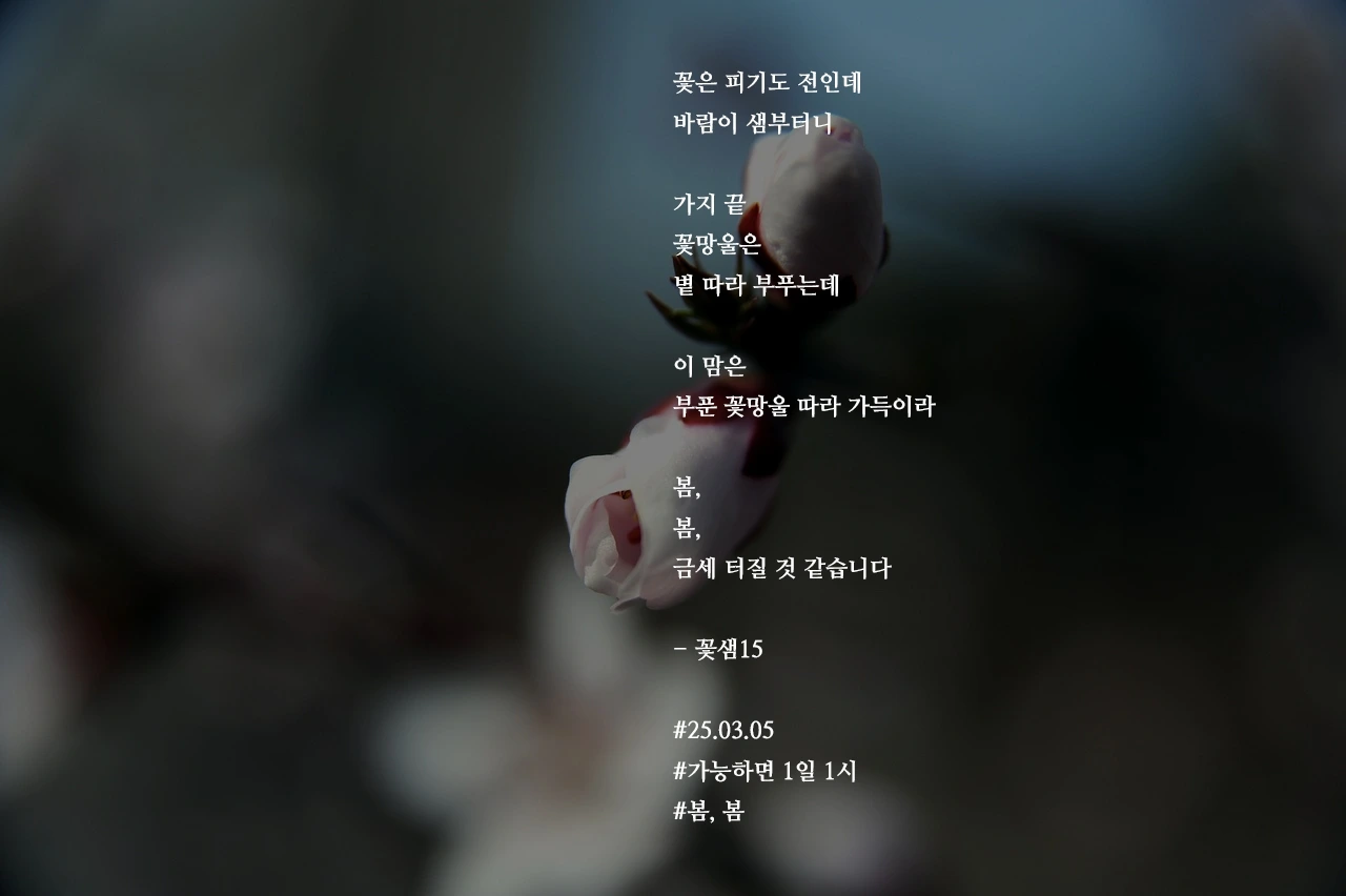 꽃은 피기도 전인데바람이 샘부터니가지 끝꽃망울은볕 따라 부푸는데이 맘은부푼 꽃망울 따라 가득이라봄,봄,금세 터질 것 같습니다- 꽃샘15#25.03.05#가능하면 1일 1시#봄, 봄