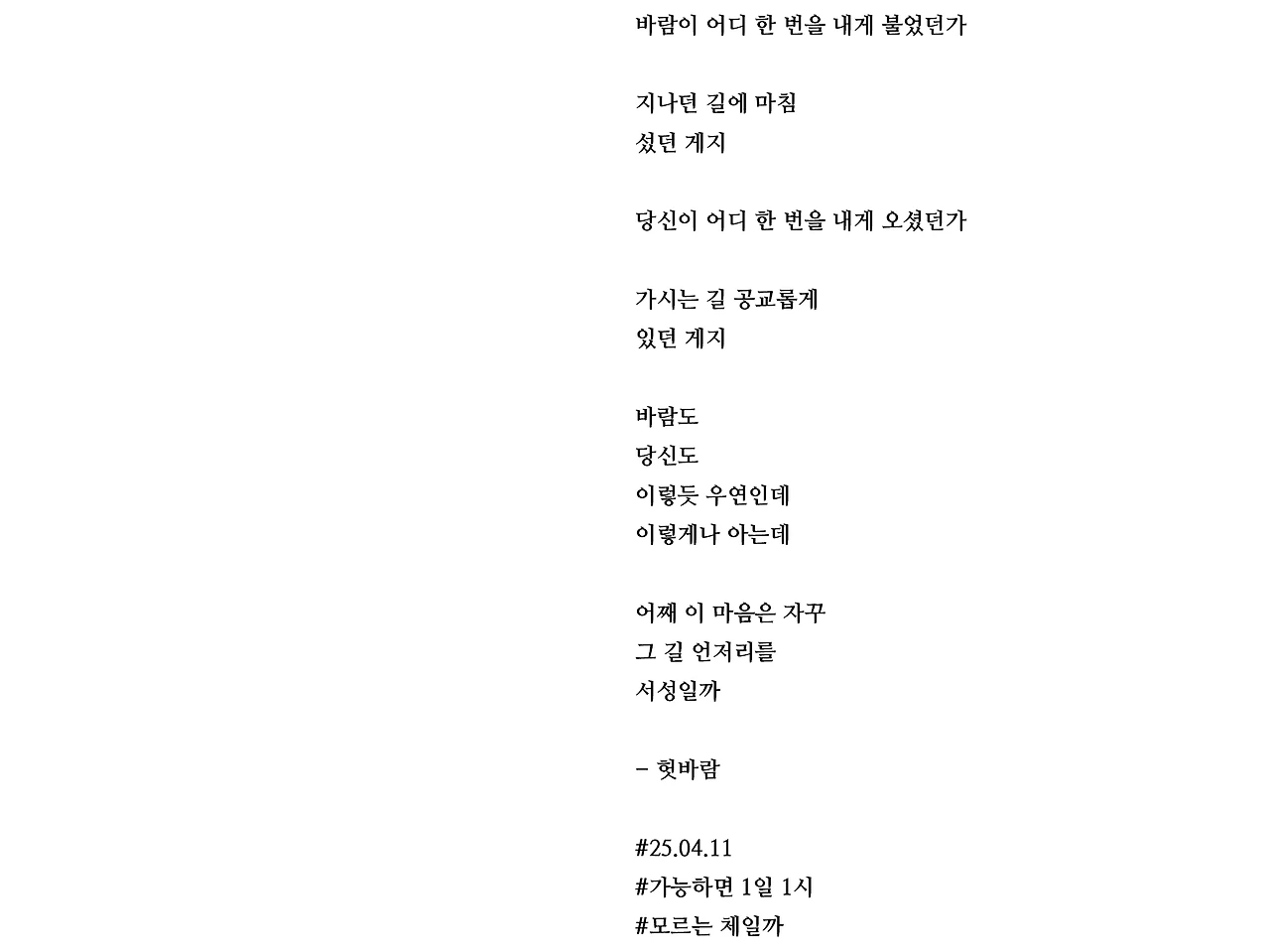 바람이 어디 한 번을 내게 불었던가지나던 길에 마침섰던 게지당신이 어디 한 번을 내게 오셨던가가시는 길 공교롭게있던 게지바람도당신도이렇듯 우연인데이렇게나 아는데어째 이 마음은 자꾸그 길 언저리를서성일까- 헛바람#25.04.11#가능하면 1일 1시#모르는 체일까