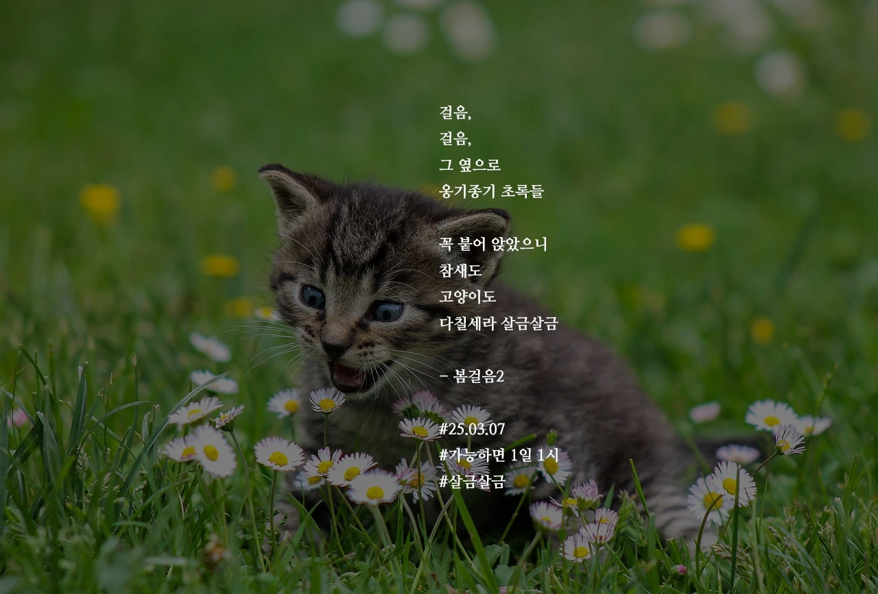 걸음,걸음,그 옆으로옹기종기 초록들꼭 붙어 앉았으니참새도고양이도다칠세라 살금살금- 봄걸음2#25.03.07#가능하면 1일 1시#살금살금