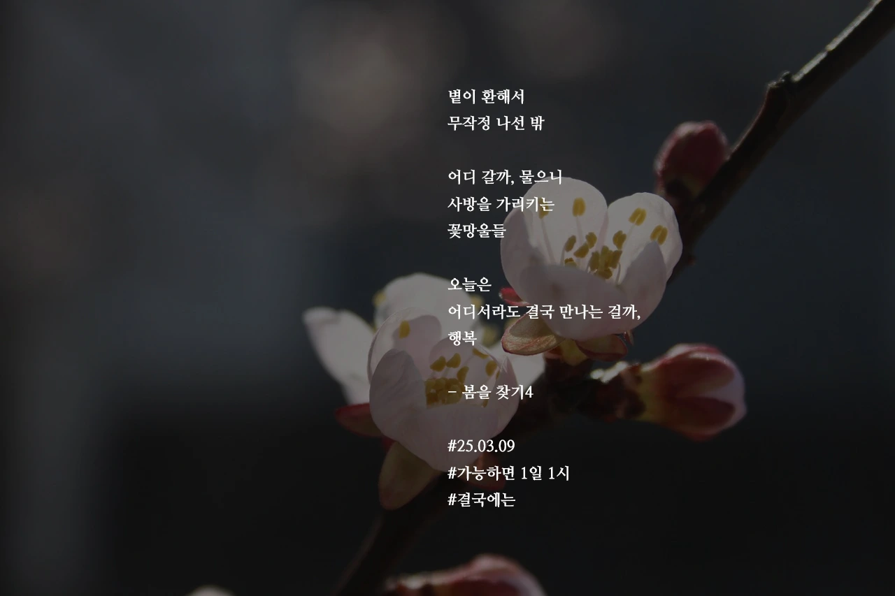볕이 환해서무작정 나선 밖어디 갈까, 물으니사방을 가리키는꽃망울들오늘은어디서라도 결국 만나는 걸까,행복- 봄을 찾기4#25.03.09#가능하면 1일 1시#결국에는 작가의 말: 여기서도 저기서도