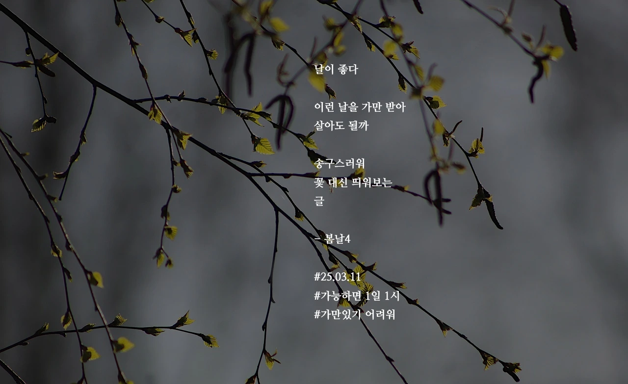 날이 좋다이런 날을 가만 받아살아도 될까송구스러워꽃 대신 띄워보는글- 봄날4#25.03.11#가능하면 1일 1시#가만있기 어려워
