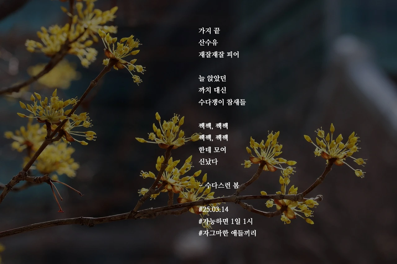 가지 끝산수유재잘재잘 피어늘 앉았던까치 대신수다쟁이 참새들짹짹, 짹짹짹짹, 짹짹한데 모여신났다- 수다스런 봄#25.03.14#가능하면 1일 1시#자그마한 애들끼리
