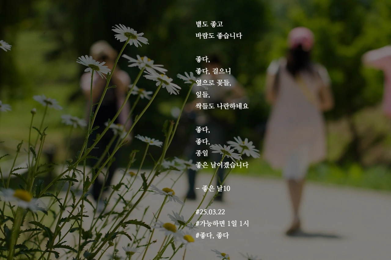 볕도 좋고바람도 좋습니다좋다,좋다, 걸으니옆으로 꽃들,잎들,싹들도 나란하네요좋다,좋다,종일좋은 날이겠습니다- 좋은 날10#25.03.22#가능하면 1일 1시#좋다, 좋다 작가의 말: 오늘도 좋은 날이었기를