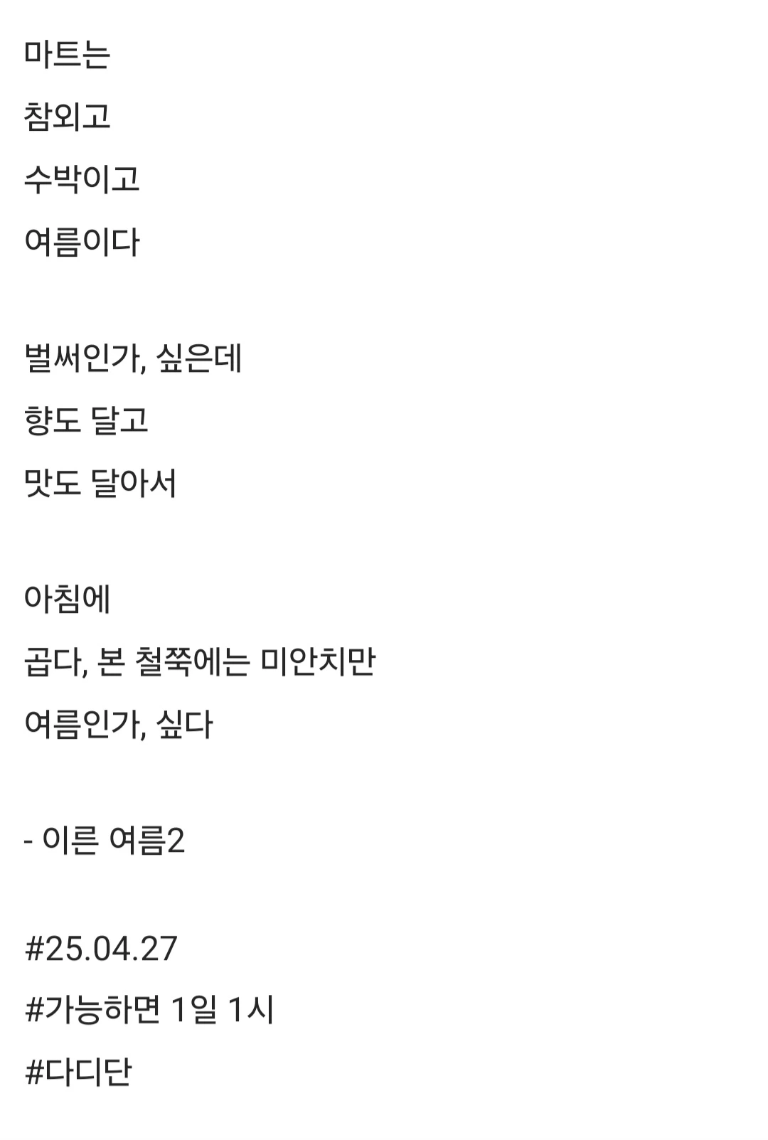 마트는참외고수박이고여름이다벌써인가, 싶은데향도 달고맛도 달아서아침에곱다, 본 철쭉에는 미안치만여름인가, 싶다- 이른 여름2#25.04.27#가능하면 1일 1시#다디단