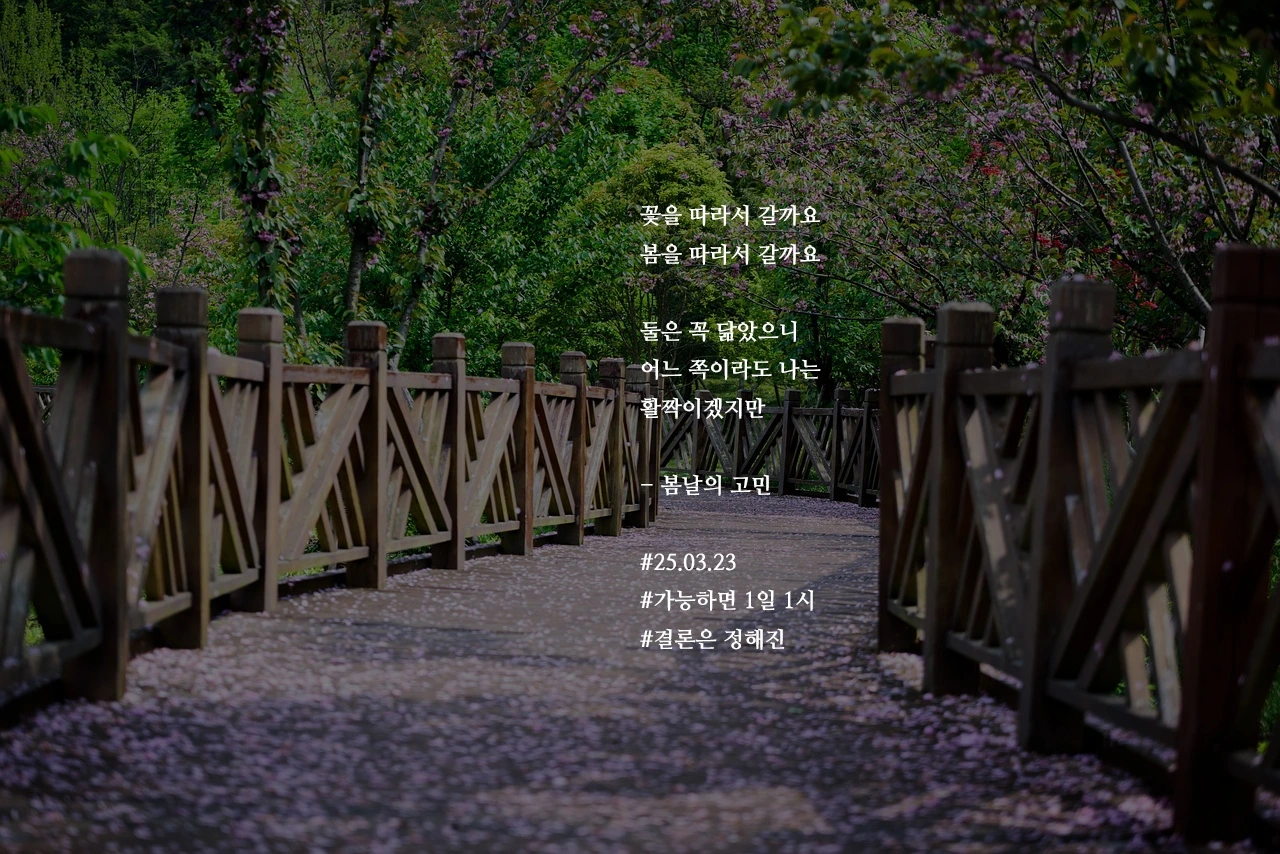 꽃을 따라서 갈까요봄을 따라서 갈까요둘은 꼭 닮았으니어느 쪽이라도 나는활짝이겠지만- 봄날의 고민#25.03.23#가능하면 1일 1시#결론은 정해진 작가의 말: 활짝인 행복에 닿으셨길