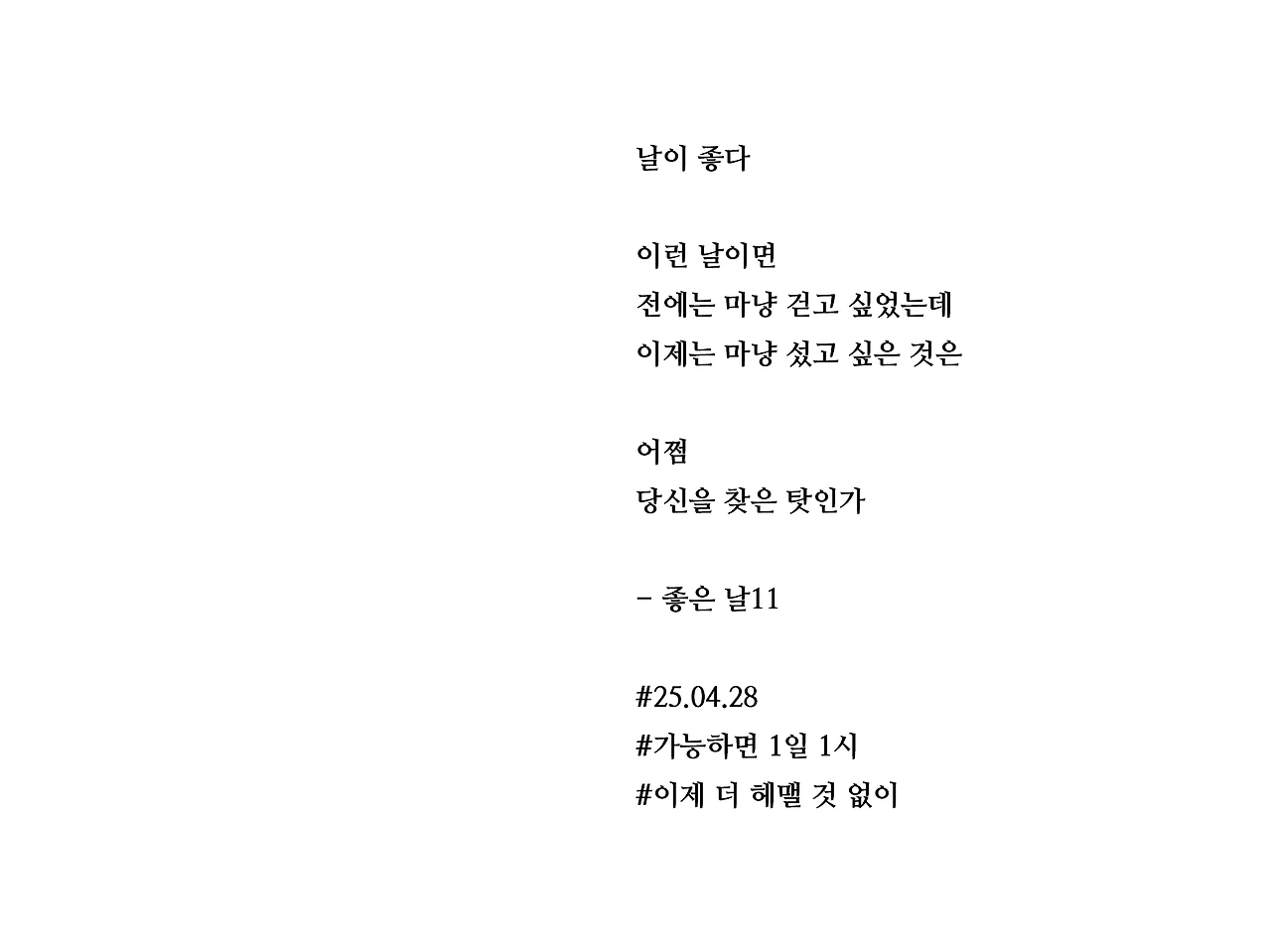 날이 좋다이런 날이면전에는 마냥 걷고 싶었는데이제는 마냥 섰고 싶은 것은어쩜당신을 찾은 탓인가- 좋은 날11#25.04.28#가능하면 1일 1시#이제 더 헤맬 것 없이
