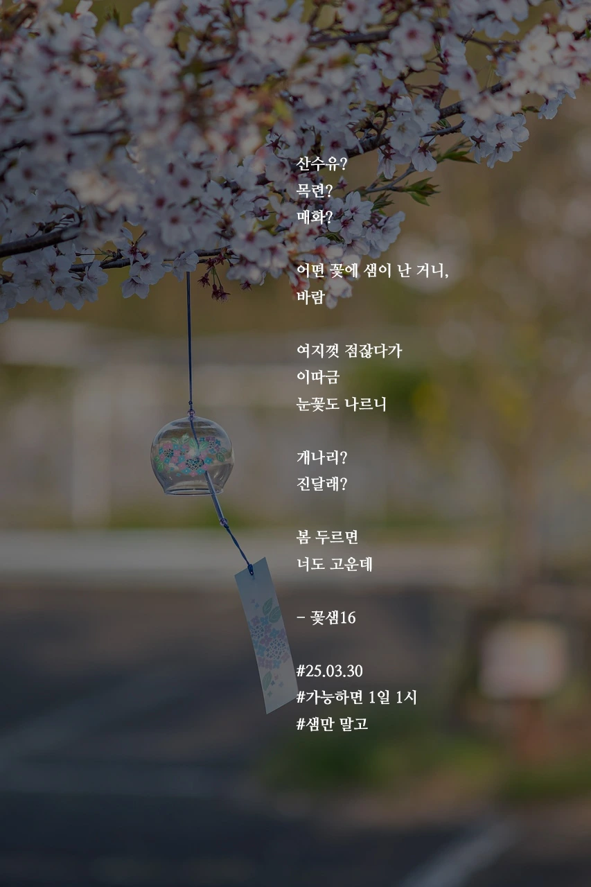 산수유?목련?매화?어떤 꽃에 샘이 난 거니,바람여지껏 점잖다가이따금눈꽃도 나르니개나리?진달래?봄 두르면너도 고운데- 꽃샘16#25.03.30#가능하면 1일 1시#샘만 말고