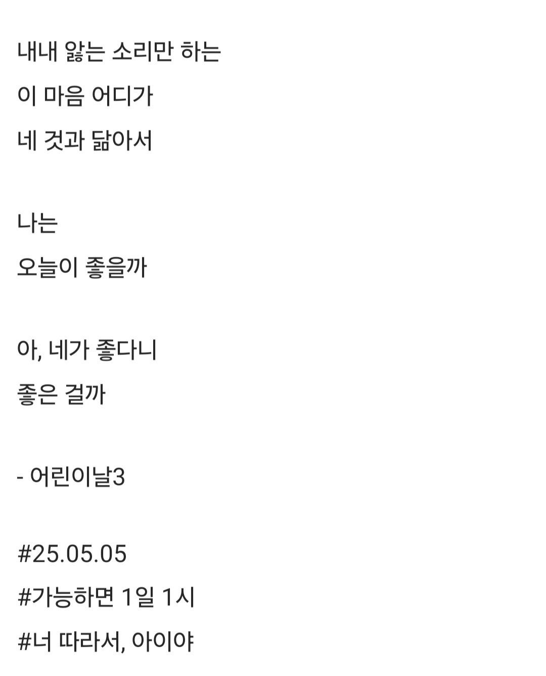 내내 앓는 소리만 하는 이 마음 어디가네 것과 닮아서나는오늘이 좋을까아, 네가 좋다니좋은 걸까- 어린이날3#25.05.05#가능하면 1일 1시#너 따라서, 아이야