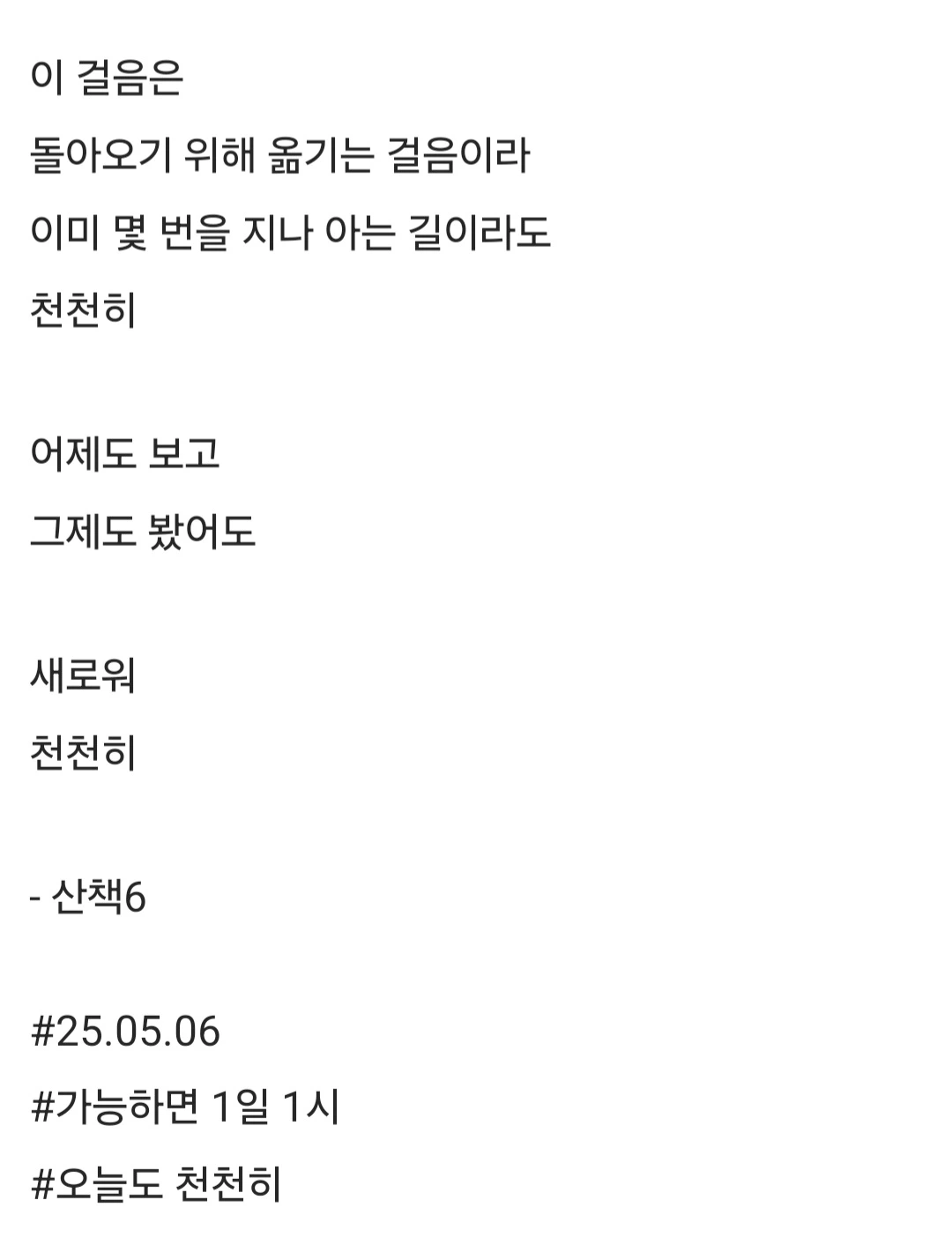 이 걸음은돌아오기 위해 옮기는 걸음이라이미 몇 번을 지나 아는 길이라도천천히어제도 보고그제도 봤어도새로워천천히- 산책6#25.05.06#가능하면 1일 1시#오늘도 천천히