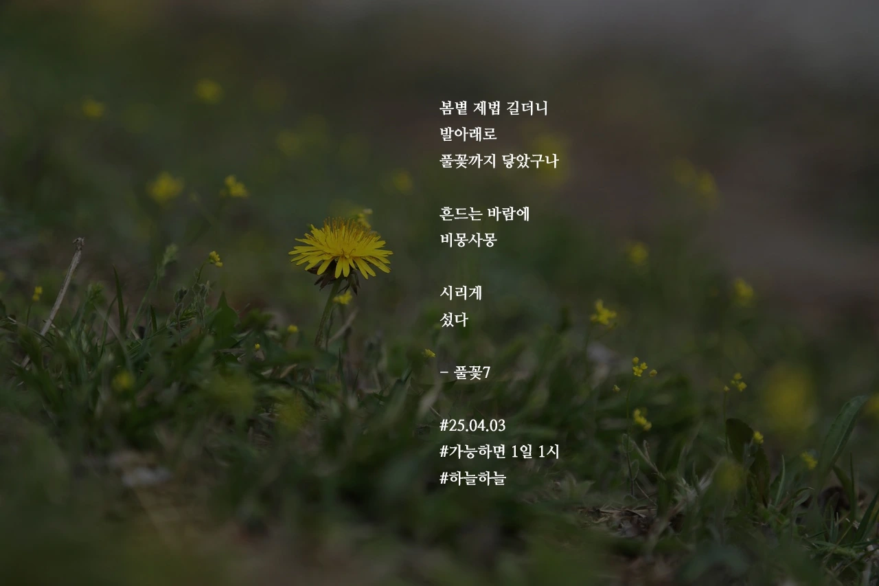 봄볕 제법 길더니발아래로풀꽃까지 닿았구나흔드는 바람에비몽사몽시리게섰다- 풀꽃7#25.04.03#가능하면 1일 1시#하늘하늘