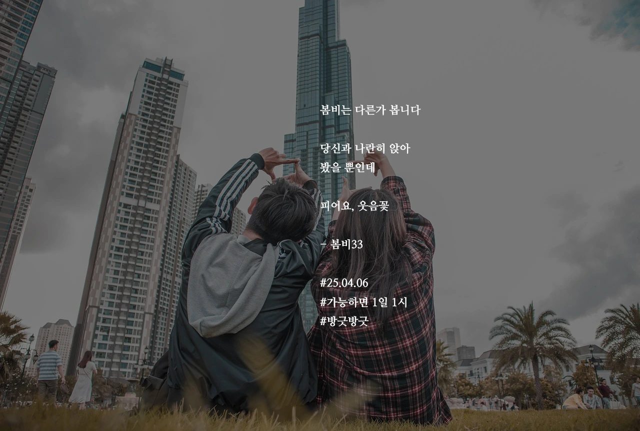봄비는 다른가 봅니다당신과 나란히 앉아봤을 뿐인데피어요, 웃음꽃- 봄비33#25.04.06#가능하면 1일 1시 #방긋방긋 작가의 말: 언제나 활짝이길