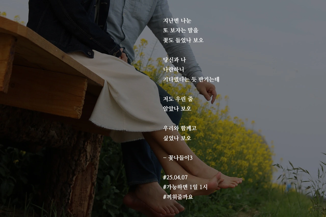 지난번 나눈또 보자는 말을꽃도 들었나 보오당신과 나나란하니기다렸다는 듯 반기는데저도 우린 줄알았나 보오우리와 함께고싶었나 보오- 꽃나들이3#25.04.07#가능하면 1일 1시#끼워줄까요