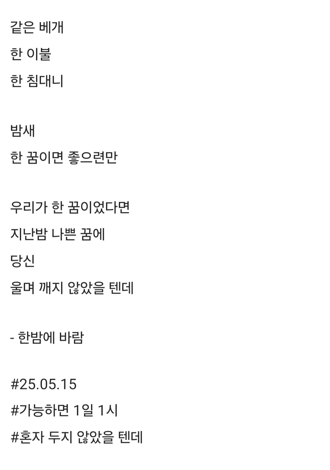 같은 베개한 이불한 침대니밤새한 꿈이면 좋으련만우리가 한 꿈이었다면지난밤 나쁜 꿈에당신울며 깨지 않았을 텐데- 한밤에 바람#25.05.15#가능하면 1일 1시#혼자 두지 않았을 텐데