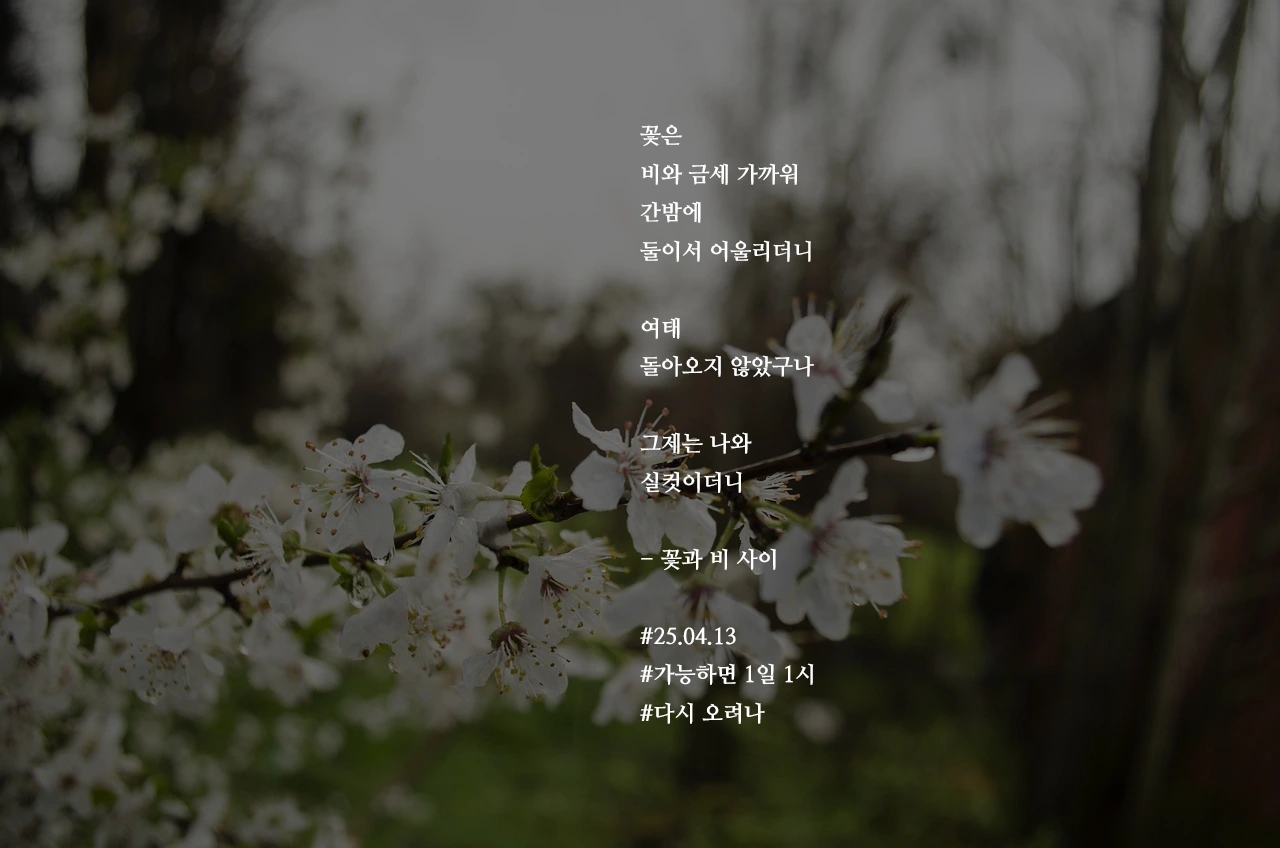꽃은비와 금세 가까워간밤에둘이서 어울리더니여태돌아오지 않았구나그제는 나와실컷이더니- 꽃과 비 사이#25.04.13#가능하면 1일 1시#다시 오려나 작가의 말: 멀리 갔는지 보이지 않네