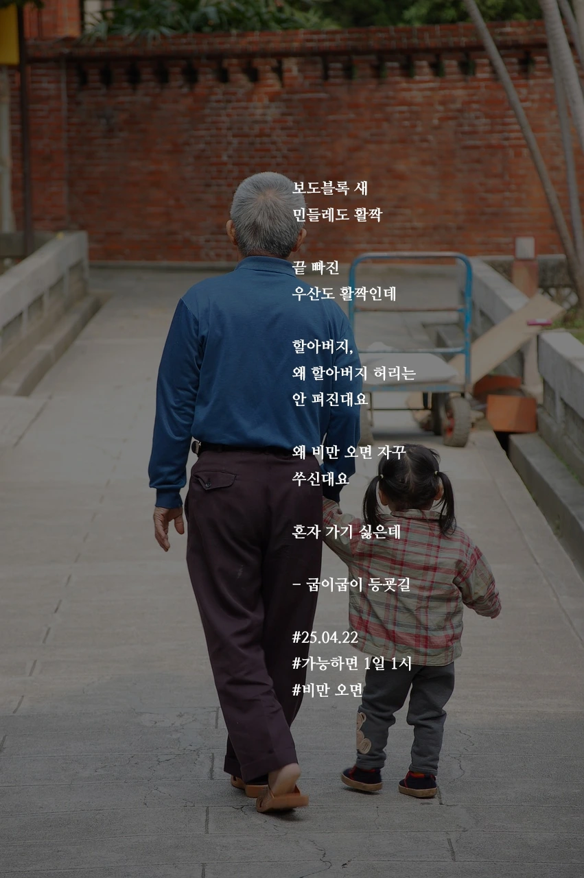 보도블록 새민들레도 활짝끝 빠진우산도 활짝인데할아버지,왜 할아버지 허리는안 펴진대요왜 비만 오면 자꾸쑤신대요혼자 가기 싫은데- 굽이굽이 등굣길#25.04.22#가능하면 1일 1시#비만 오면
