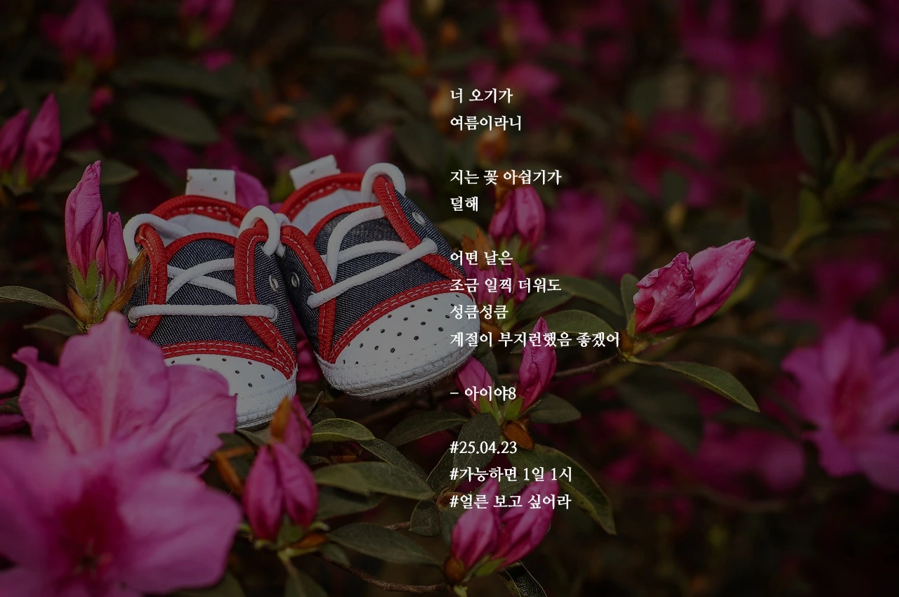 너 오기가여름이라니지는 꽃 아쉽기가덜해어떤 날은조금 일찍 더워도성큼성큼계절이 부지런했음 좋겠어- 아이야8#25.04.23#가능하면 1일 1시#얼른 보고 싶어라