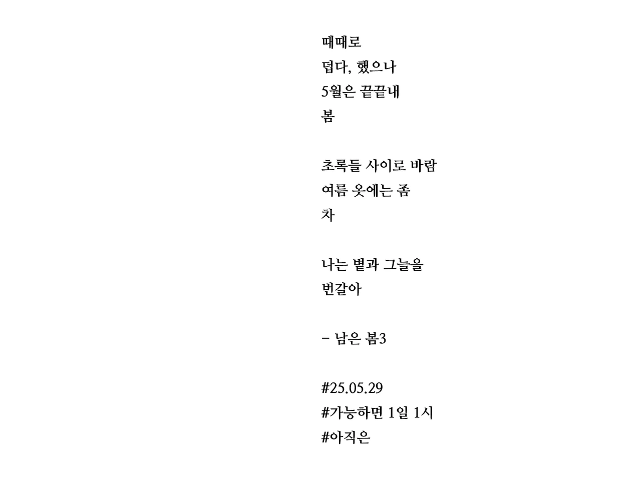 때때로덥다, 했으나5월은 끝끝내봄초록들 사이로 바람여름 옷에는 좀차나는 볕과 그늘을번갈아- 남은 봄3#25.05.29#가능하면 1일 1시#아직은