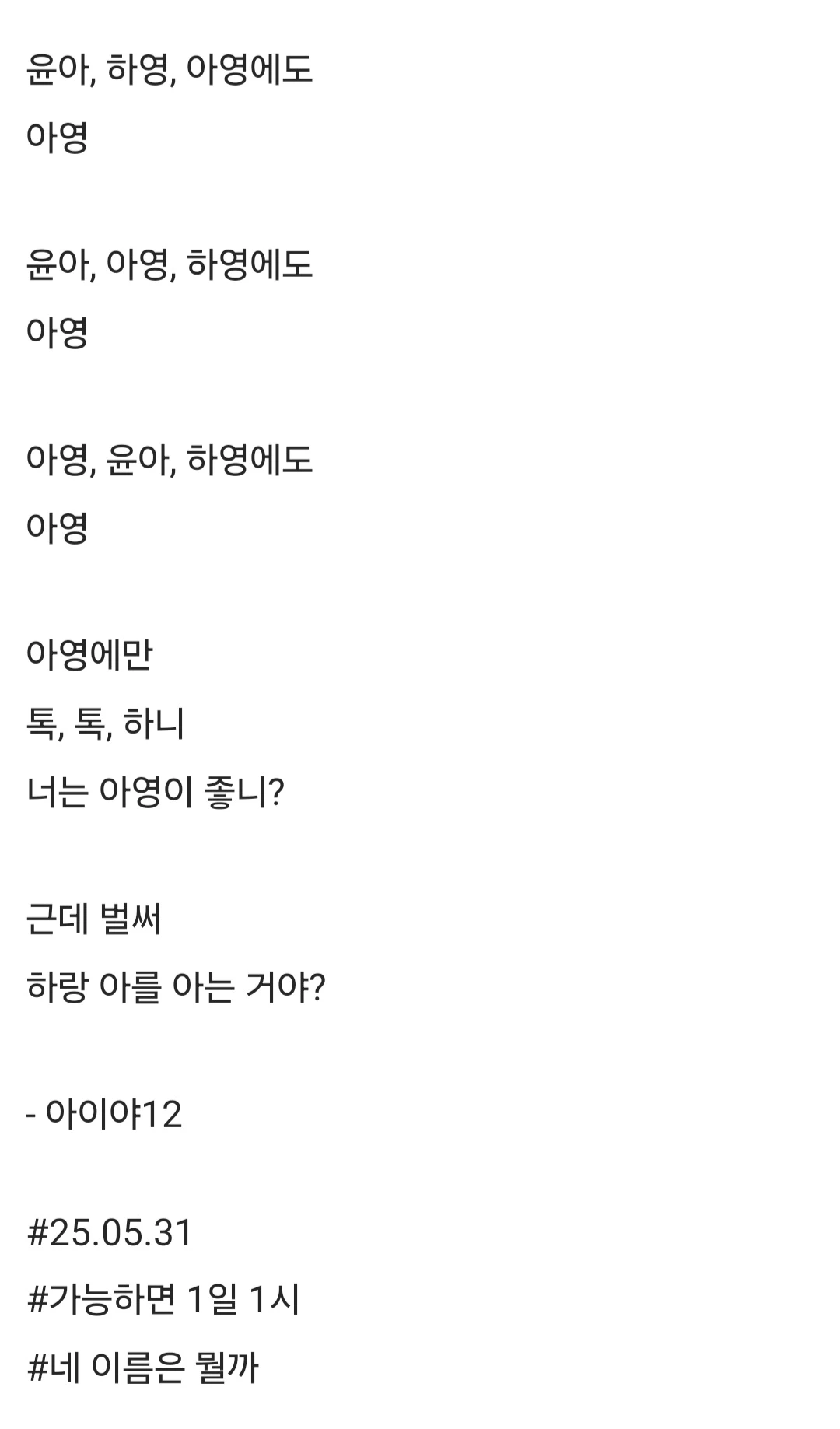 윤아, 하영, 아영에도아영윤아, 아영, 하영에도아영아영, 윤아, 하영에도아영아영에만톡, 톡, 하니너는 아영이 좋니?근데 벌써하랑 아를 아는 거야?- 아이야12#25.05.31#가능하면 1일 1시#네 이름은 뭘까