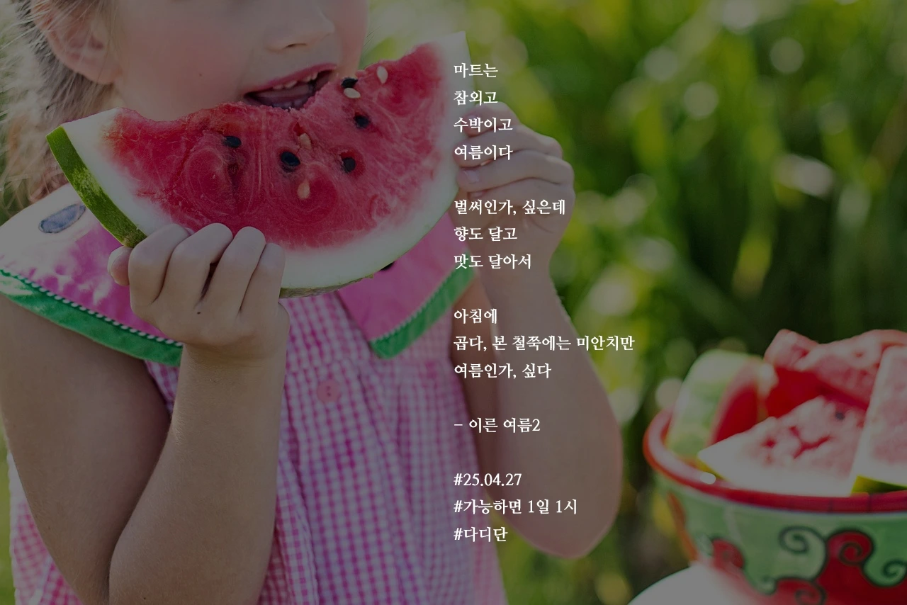 마트는참외고수박이고여름이다벌써인가, 싶은데향도 달고맛도 달아서아침에곱다, 본 철쭉에는 미안치만여름인가, 싶다- 이른 여름2#25.04.27#가능하면 1일 1시#다디단 작가의 말: 배 속은 일찌감치 여름이었다